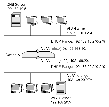 ADD DHCP POLICY=base SUBNET=255.255.255.0 DNSSERVER=192.168.10.5 NBNAMESERVER=192.168.20.5 ↓