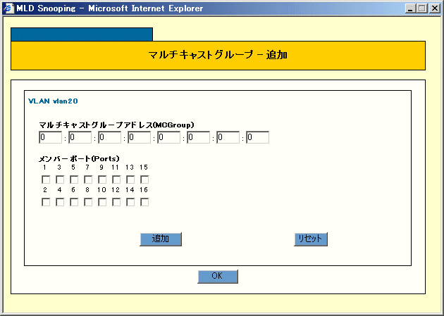 対象VLAN一覧でマルチキャストグループを追加したいVLANにチェックを付け、マルチキャストグループ一覧の「追加」ボタンをクリックすると、「マルチキャストグループ-追加」が表示されます。