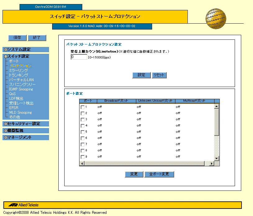 一覧の中から、設定を変更したいポートにチェックを付け、「変更」ボタンをクリックすると、「パケットストームプロテクション設定」が表示されます。