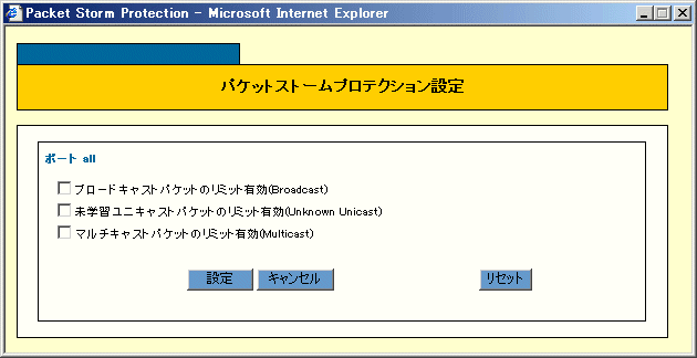 ブロードキャスト、未学習ユニキャスト、マルチキャストの各パケットに対する、パケットストームプロテクションの有効/無効を設定します。